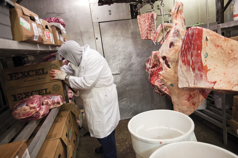 The fact that managers and brothers Mike Baehl and Chris Baumgart allow Evansville Business to tour the facility is a testament to their cleanliness. And maybe this atmosphere is the reason the brothers show off their neighborhood butcher shop, launched by their father in 1983, with pride. In the freezer, the floor is spotless. Large pieces of cow — attached to cool, steel hooks — hang from the ceiling. Nearby, an industrial-sized grinder waits for fat trimmings to make sausage, and that sausage waits to be encased in a hog’s small intestine, held in a plastic cup for now. Outside, three tables with circular saws denote where the butchers act like surgeons with precise cuts for beef, pork, and cooked meat. The sight of the shop is much different for a meat eater used to buying beef and pork in tight, small plastic packages, says Baehl, but the brothers’ meat — examined by a health inspector daily — comes from local producers.