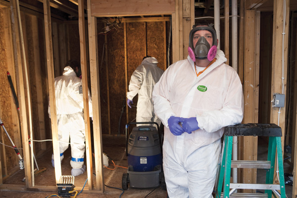 Waddell claims he never has experienced physical or mental harm from mold exposure, but that likely is due to the rigorous safety measures. Paul Davis Restoration professionals often discover mold when they’re called in for a different problem, and as soon as they spot fungal growth, they suit up in a face respirator, Tyvek suit, gloves, and boots, then surround the area with plastic sheeting to avoid contaminating other rooms.