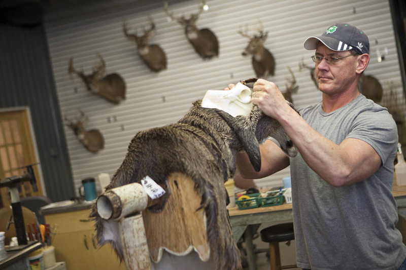 Knight pickles the skin in a vat of salt and acid. From there, he places it in a tanning solution, which gives the skin a leathery feel. Then, Knight moves the skin over the Styrofoam form. He glues it to the form with a series of complex tucks and folds to create curves essential for making expressive animals. The end result for Knight often is an award-winning piece seen in state and national competitions.[pagebreak]