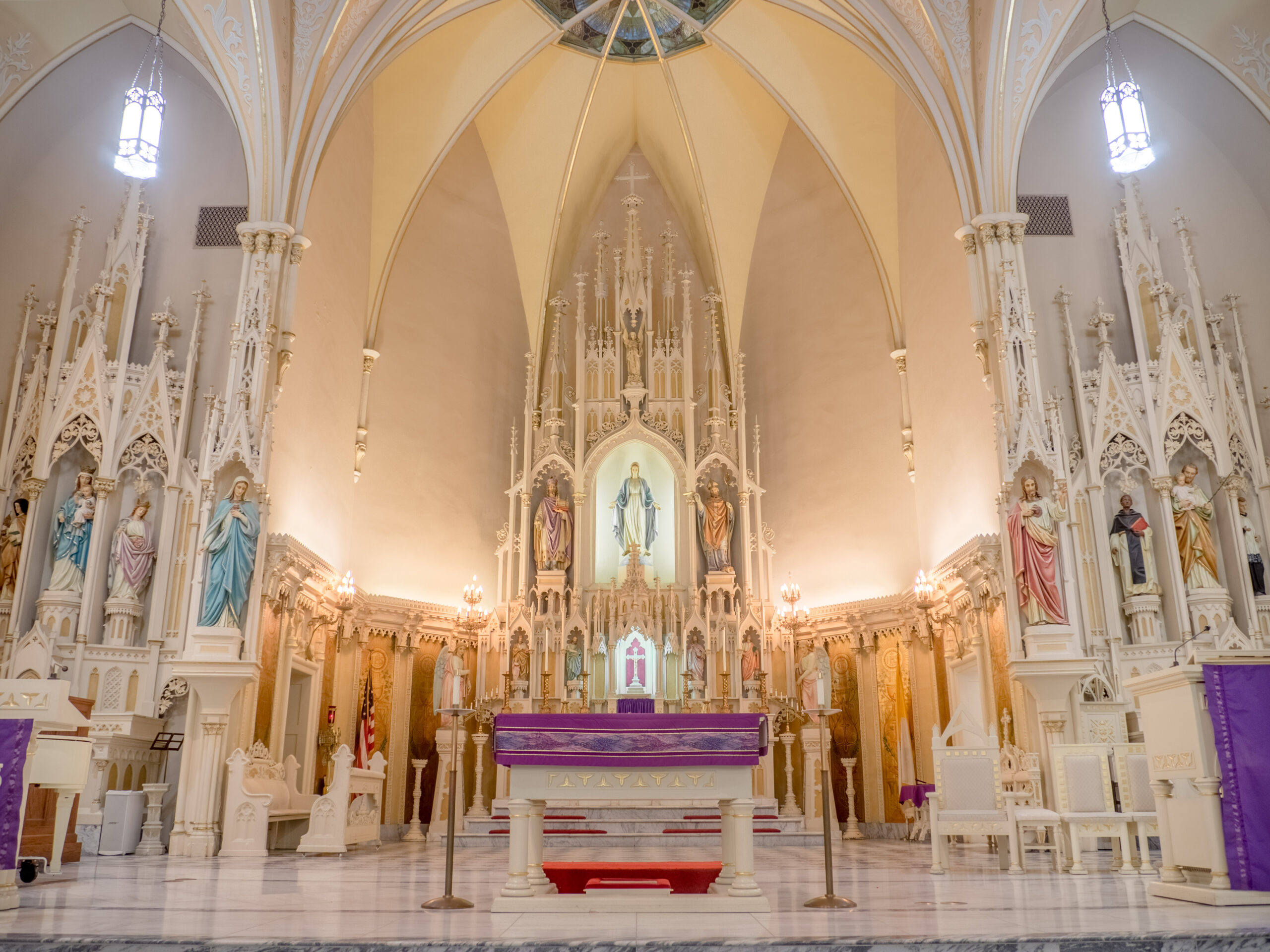 The stained-glass windows inside St. Mary’s Catholic Church are stunning with the Assumption of Mary into Heaven over the main doorways of the sanctuary being one of the most breathtaking in the city. The church features a 50-foot-high center ceiling as well as a 175-foot outdoor spire, which houses three bells — St. Michael, St. Mary, and St. Aloysius.