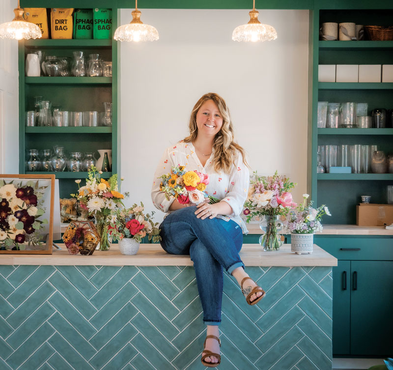 Jesse Jeanne’s Flower Boutique needed upgrading. Diekhoff “completely redid all of it,” replacing moldy walls plus the floors, electrical, and lighting with help from friends and family. The shop is painted in shades of pink and green, and the store’s logo is Diek- hoff ’s and her year-old daughter Sammie’s birth flower – lily of the valley – and tulips.