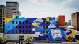 If you've recently driven past Old National Bank’s building at the corner of Fourth and Sycamore streets, you’ve likely noticed a bright and bold new mural livening up the Downtown Evansville landscape. Often Seen Rarely Spoken, a mural collective based