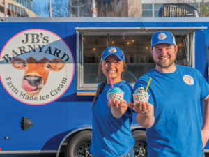 The bold blue trailer, easily recognizable to Evansville residents as the JB’s Barnyard ice cream truck, had been parked Downtown for only 20 minutes when a line began to form. While owners Briley and Jared Simpkins were visiting for an