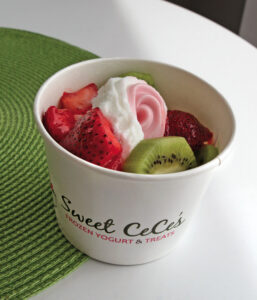 Inside Sweet CeCe’s in Newburgh, cheerful shades of hot pink, lime green, and orange brighten the strip-plaza space. Corrugated metal lines the cash register counter, lending an industrial, modern contrast to the sugary-sweet wall colors. With frozen yogurt machines, candy