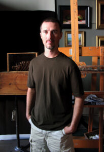 Henderson, Ky., artist Chris Thomas’ small painting of a silvery-shelled nautilus arranged against a luxurious piece of blue silken fabric is striking. As in many of Thomas’ paintings, “Blue Nautilus” shows a concise mastery of composition and detail, reflecting the