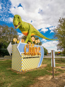Driving along Riverside Drive approaching Downtown Evansville, one enjoys stunning views. Now that scenery includes a 20-foot-tall T-Rex statue. After 12 years across from the Children’s Museum of Evansville, at 22 S.E. Fifth St., mascot Millie The Dinosaur has a