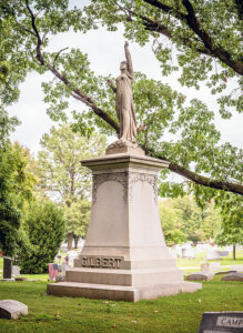 Along the western edge of Oak Hill Cemetery in section C, Lot 118 holds a lone grave along with a monument of a woman reaching toward the heavens. The name Gilbert is etched into the granite and the single member