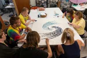 Jennifer Parker’s ceramic plates and bathroom tile were the perfect colors to include in a ceramic mosaic for SWIRCA & More’s 50th anniversary. It was made by team members at The Hope Gallery in Newburgh, Indiana, and recently unveiled at