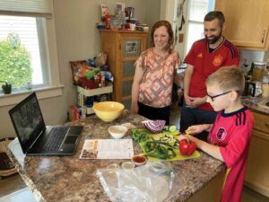 Class is in session – in the kitchen – at the cross-town homes of Daniel and Mallory Latini and Sally and Kevin Lager. As many as 30 families are tuned in to Book N’ Cook, a monthly series of Saturday