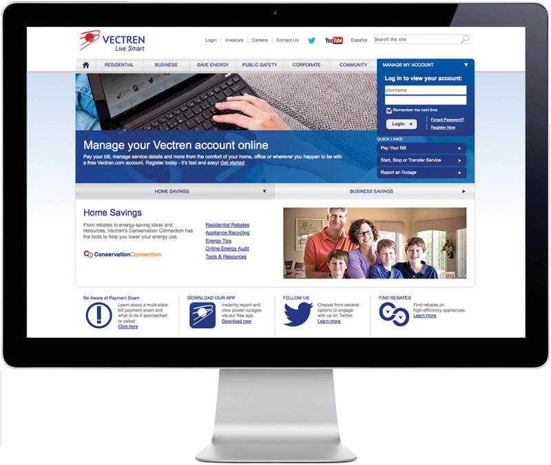 On the home page, the login access is easily visible at the top right of the page. The site also features links for viewers to connect with Vectren’s Twitter and YouTube accounts. The site is concise, sleek, and appealing, with numerous resources for users. It has more than 6 million visits per year, averaging 24,000 per week day, according to Chase Kelley, vice president of corporate communications. A total of 365,000 customers have a registered account with Vectren.com. The site averages 110,000 bill payments a month.