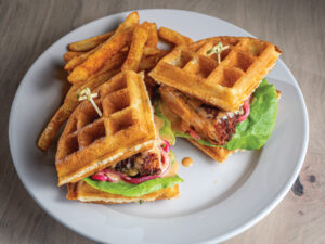 Why It Stands Out: Considered a Southern staple, this combination of breakfast and dinner somehow makes sense when put together. Butter and maple syrup already have an important role in fusing the two parts’ savory and sweet attributes. Copper House elevates this idea by using waffles instead of buns. Their chicken and waffle sandwich is served with lettuce, pickled red onion, and spicy maple mayo, providing a little kick to the homestyle creation.