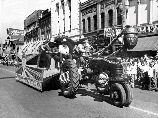 â–² Nut club parade down Main Street promoting the 1947 Silver Anniversary Fall Festival.