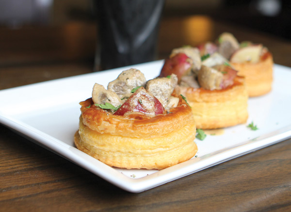 A recent combination offered steak, red potatoes, and mushrooms as a filling topped with a cream Guinness sauce. The dish offers three of the pastries in one appetizer and is perfect paired with a pint of Guinness beer, says Taylor.