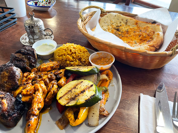 The Sassis also offer vegetarian options like baba ghanouj and eggplant salad as well as vegan choices such as stuffed grape leaves, falafel, and hummus.