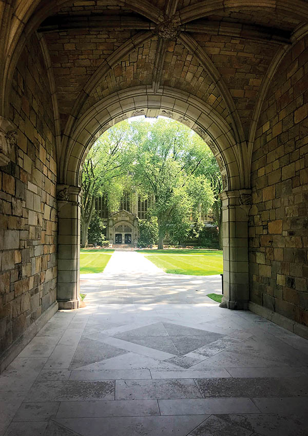 Across from it is the pillared main entrance to the University of Michigan Museum of Art, one of the oldest university collections in the U.S. The Louis Comfort Tiffany decorative glass collection includes a magnificent door from the Henry O. Havemeyer house in New York, created by the artist in 1890.