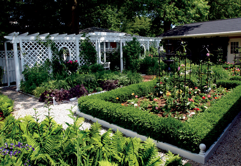 The gravel pathways encircle the space and divide the four garden beds. The back two hold a variety of ferns, the front two are filled with Gerbera daisies in the summer and pansies in the fall. The beds are bordered with boxwoods, an idea borrowed from a tour of gardens in England.