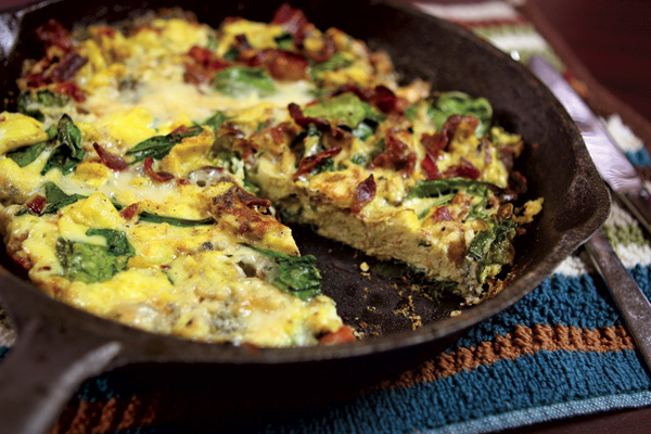 I used Oasis eggs for this frittata. This recipe showcases what a delight the eggs are to the eyes and palate, but the real beauty of a frittata is the simplicity of its preparation. One of my favorite flavor trios is the combination of spinach, bacon, and some form of bleu cheese. I prefer Gorgonzola (because it pairs well with smoky bacon), but if you want a more pungent cheese, by all means, go for it.