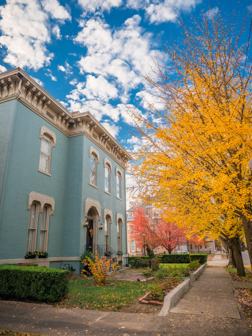 There’s a special type of beauty in a ginkgo tree during the fall. The fanned green leaves turn a vibrant, eye-catching yellow before they cover the ground in all their splendor. Along Southeast Second Street in the Historic Riverside District, the home of David and Christina Brown — built in 1871 by John Iglehart (of Iglehart & Taylor Attorneys and Counselors) — compliments the lush yellow fall color with its pale blue paint and stunning Italianate architecture. Each year, the turning of the gingkoes in front of the Browns’ home (which the couple have lived in for 25 years) catches the gaze of many, drawing in visitors to capture the beautiful colors in photos.