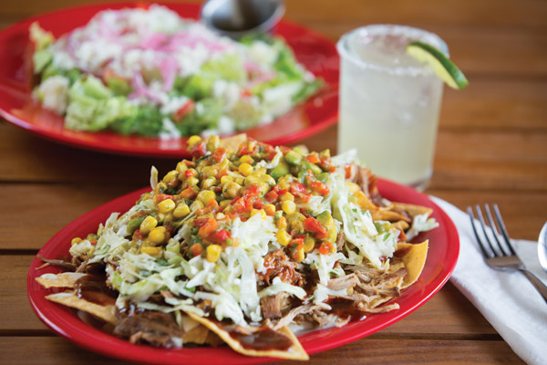 BBQ Nachos and Chips and Queso: Begin with crisp tortilla chips and creamy queso before ordering the BBQ Nachos, which have house queso topped over pulled pork, slaw, corn and avocado salsa, and BBQ sauce.