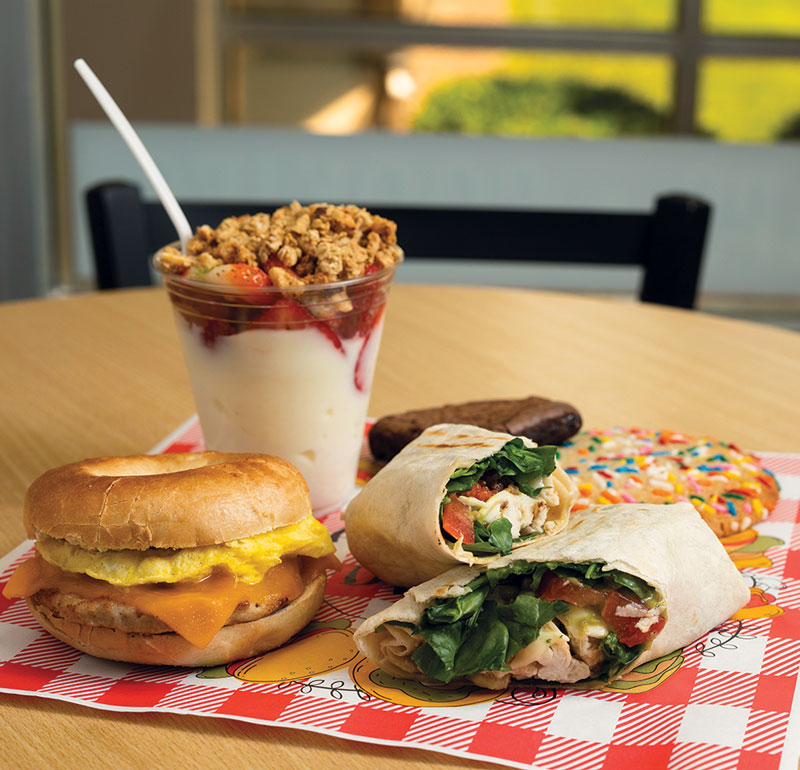 Diners can order burritos, casseroles, sandwiches, oatmeal, yogurt, biscuits and gravy, fruit, wraps, melts, salads, smoothies, and baked items like scones, muffins, cinnamon rolls, and cookies. Breakfast is an all-day affair, with coffee including lattes for sale. Daily lunch specials range from pasta to smoked pulled pork or chicken-loaded baked potatoes to taco salad. Maria says customers’ favorites are the breakfast burrito consisting of an egg mixture with a choice of bacon, sausage, or ham, as well as the California wrap, filled with chicken, bacon, avocado, onion, tomato, spinach, and chipotle dressing.