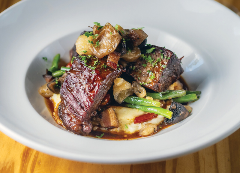 “Hubert’s mother (who had Italian heritage but was French born) inspired our beef bourguignon recipe that is used in the restaurant. It is a crowd pleaser, with a decadent flavor that brings up images of family-style dinners. Serving from a large china platter onto expectant guests’ plates makes the dish communal and hearty and perfect for the holiday season. Julia Child’s method, explained in the recipe, is similar to the one Hubert’s mother showed us — she didn’t give us written directions, we just had to watch her do it to learn the technique. One thing we’ve learned is that short ribs hold the flavors the best, and that it must use a light red wine, like pinot noir. A bolder red wine will create a bitterness to the dish.” — Katy Mussat