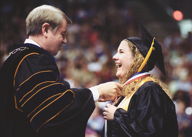 That’s a remarkable statement, given all that’s been accomplished. On his watch, major building projects have arisen on the campus, including several new classroom buildings, four new residence halls, a new art center, and a library named for his predecessor. The number of students who’ve graduated from USI has risen from just over 11,000 in 1994 when he arrived to nearly 27,000 by 2008. The number of undergraduate majors has increased to 60, along with 10 master’s degree programs, and the first program at the doctoral level, the Doctor of Nursing Practice.