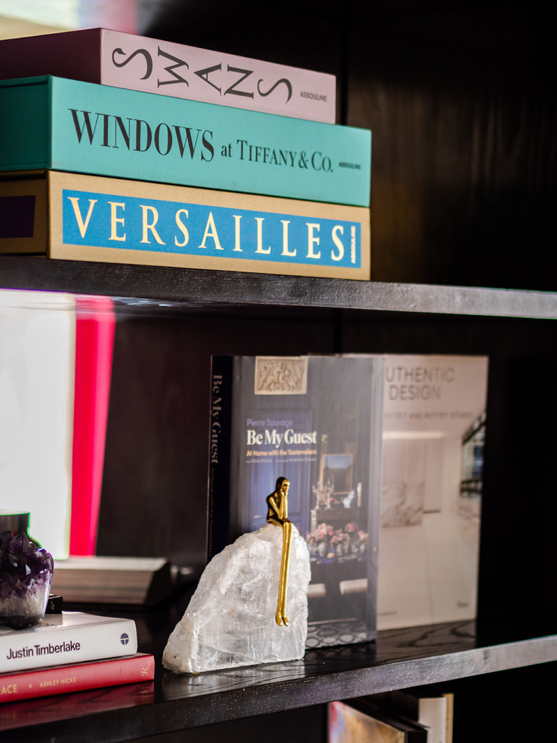 Her geodesic home on Newburgh Road creates a unique layout for a personal library. Eight 10-foot-tall black, open bookcases store volumes related to design, art, travel, architects, and pop culture that she has collected over 10 years. The exact count is unknown, but her children, Dean, 15, and Estella, 12, joke that she has “more books for interior design than Barnes & Noble,” she says. “Not only do I love to design with books, I love to be inspired by seeing the works of other interior designers. I use the books to pull inspiration from designs across the world.”