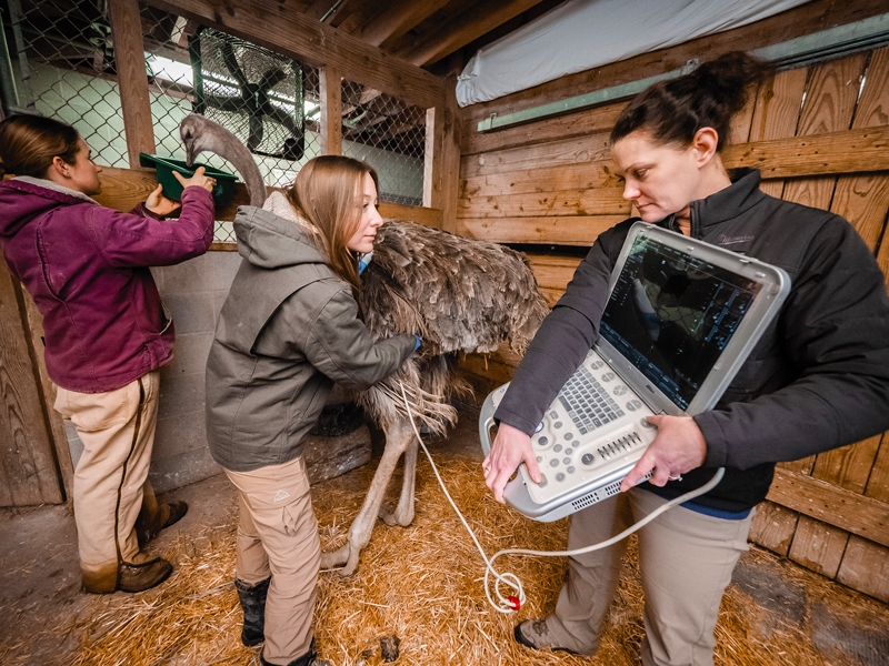 It’s never a dull day on the job at Evansville Business, as we discovered in January while tagging along with Mesker Park Zoo & Botanic Garden’s veterinary staff for a behind-the-scenes story. This in-the-moment image captures the teamwork of Lisa Merrick, veterinarian Sam Bradley, and Kristine VanHoosier — distracting, scanning, and operating equipment — as they perform an ultrasound on Feather the ostrich.
