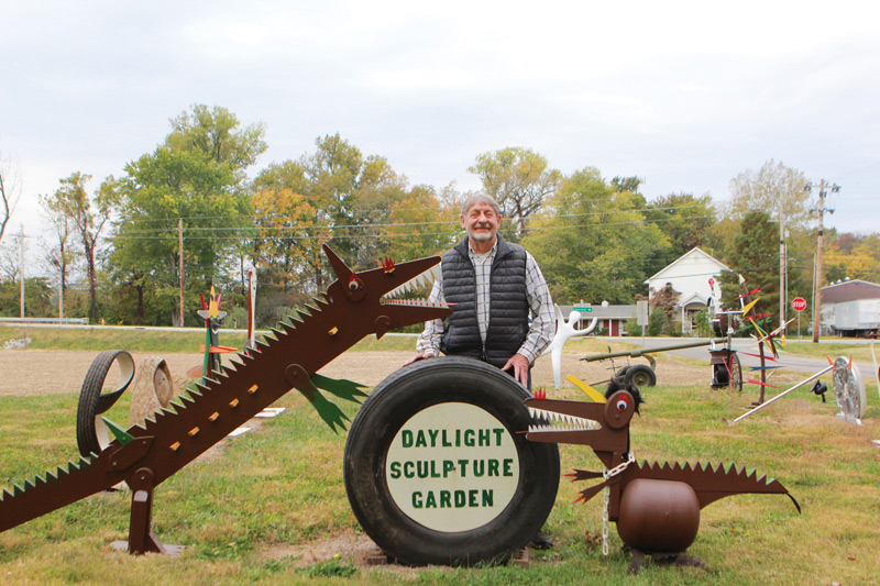 Some sculptures mimic Gatling guns and military equipment representing Young’s service as a U.S. Army field artillery master sergeant. Others are the work of an Oakland City, Indiana, artist and creator of the “Aerial Beauty” sculpture outside Evansville Regional Airport, Bob Zasadny. The most eye-catching of Zasadny’s creations is a six-foot yellow and blue semicolon embodying support for suicide prevention and awareness. The sculpture is a smaller version of the same piece in Princeton, Indiana’s Bicentennial Park.