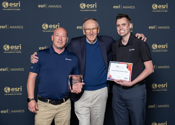Evansville Water and Sewer Utility’s GIS team received a Special Achievement in GIS Award from Esri, the global leader in geographic information system software, during a national conference in July. EWSU GIS Manager Ryan Key and Technician Aaron Krohn accepted the award from Esri co-founder Jack Dangermond for their work using GIS to improve government transparency and better serve the public.