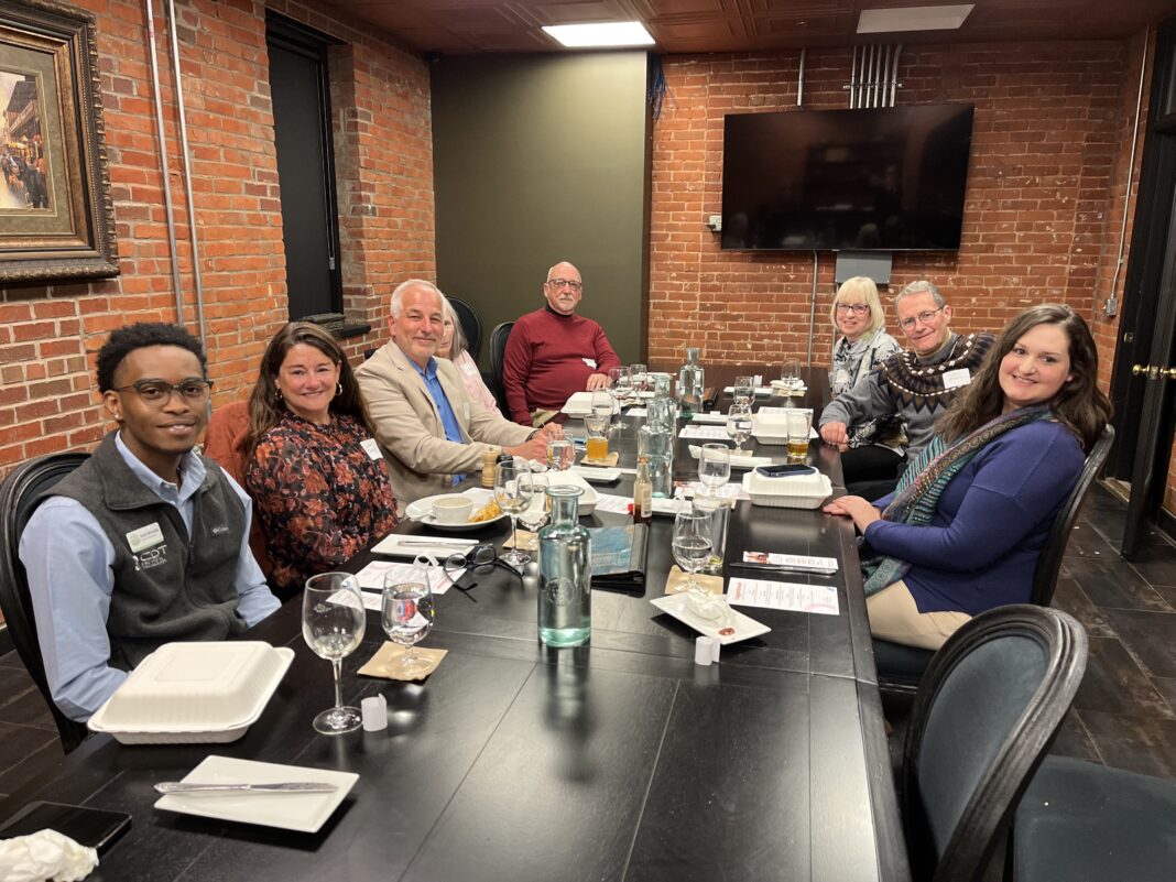 Over plates of fried pork street tacos, couscous, and penne pasta, the group of nine assembled in a quiet private room upstairs at Copper House spoke of how they connect with their ancestors — one plays golf, a favorite pastime of his late grandfather; another bakes, carrying on a family tradition. In a discussion facilitated by Del Doughty, dean of liberal arts at the University of Southern Indiana, participants bantered about what defines an ancestor, as well as what being a “good” one means. All agreed that a key to being a good ancestor is considering past and future generations, which isn’t limited to just humans. One participant spoke of watching the coring of a tree and witnessing it show audible and visual signs of life, a moving testament to nature’s centuries-old legacies.