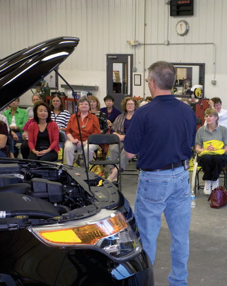 Divided into two groups, the education begins. One group learns about collision safety from Lefler. He makes an airbag explode. The other group learns about car maintenance from Ed Dietz, Lefler’s district manager. After each 45-minute session, a brief intermission allows Lefler to pass out door prizes, and then the two groups switch classrooms. At the end, women win more door prizes. (I was amazed at the amount of prizes, including oil change certificates and jewelry.)