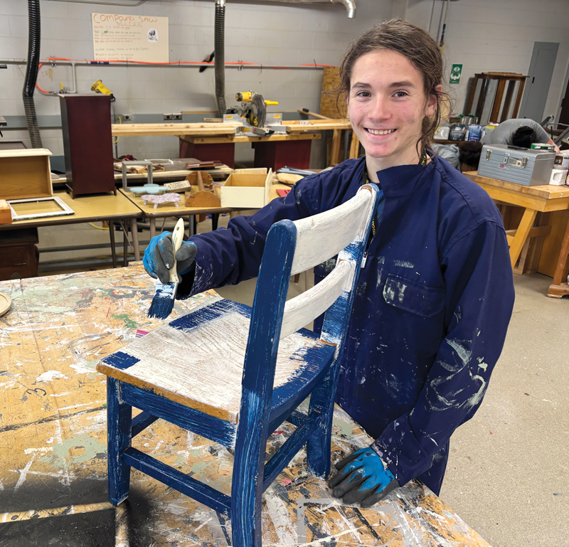 Most projects involve artistic touch-ups or repairs on older items that could use some sparkle: kitchen chairs stenciled with pretty florals, end tables washed in trendy colors, even seven-piece dining sets given a showroom-ready finish. Class time is focused on repurposing items, with some construction activity involved. Once they gain experience, students can complete 3-4 projects per nine-week period of the academic year. Last year, about 50 pupils sold $10,547 worth of product.