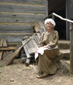 The semi-circular Memorial Visitor Center (also free to enter) dates to 1943 and features a film, memorial halls, and artifacts. About 130,000 people visit annually. Lining its exterior are five sculpture panels depicting stages of Lincoln’s life. Hike a little more than a mile across the Thomas Lincoln Farm, named for the president’s father — whose handcrafted bowfront bureau built for neighbors was featured in Evansville Living in 2024 — and check out a primitive cabin and pioneer setting from the early 1800s, brought to life by reenactors. Peek inside the ramshackle cabin and marvel at how the Lincolns likely lived – three sisters in one bed, parents in another bed, and Abraham and his two brothers upstairs. Erin Hilligoss-Volkmann, the memorial’s director of education and resource management, says the reproduction “is based on Lincoln’s own writings.”