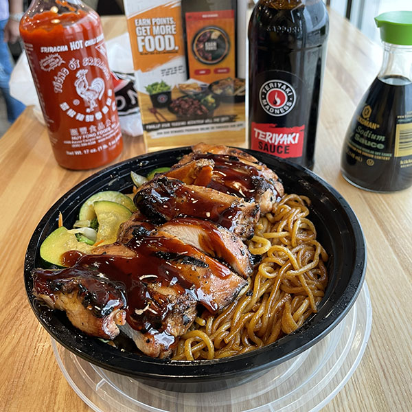 The menu is built around bowls, which start with a rice or noodle base; a large portion of vegetables including zucchini, carrots, onion, and broccoli; your choice of protein ranging from orange chicken or salmon to spicy chicken; and finally, a hearty drizzle of teriyaki. Katsu and yakisoba-style bowls are also available.