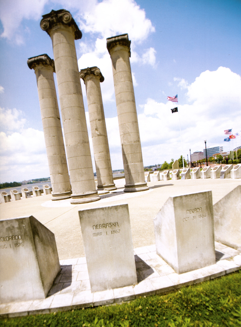 Erected in 1976 based on a design by Evansville architect Rupert Condict to celebrate the nation’s bicentennial, the monument is also rooted in Evansville’s history. The limestone columns once adorned the C&EI Railroad depot near Downtown Evansville. The building was designed by architect Daniel Burnham (who also designed the Flat Iron Building in New York City and Union Station in Washington, D.C.) The train station was torn down in 1961, but the columns were spared. Now they loom above 50 limestone pedestals that symbolize the states of the union. The 13 steps leading to the monument represent the 13 original colonies. The monument has long been one of the most recognizable landmarks in the city, but it is much more. Looming large on the riverfront, it is a gathering spot for both solemn and celebratory events.