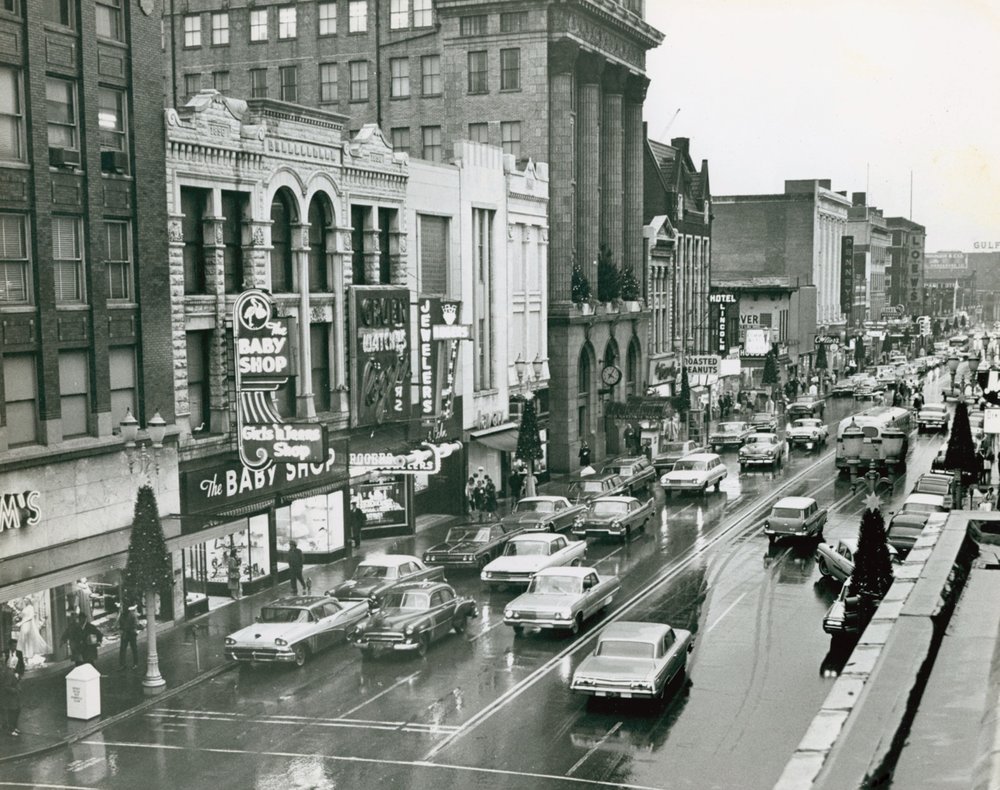 In a photograph from the Evansville Museum of History, Arts and Science collection, Christmas time on Main Street shows four lanes of traffic going both ways and street views of the most popular shops of the time. This snapshot from 1962 was taken at Fourth Street, facing Fifth and Sixth Streets.