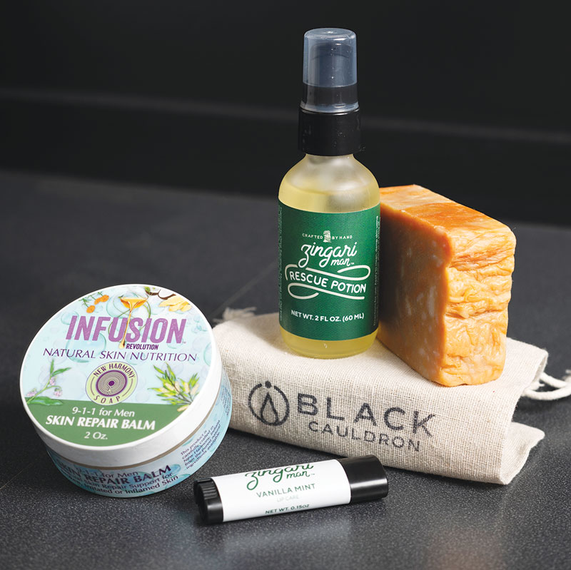 Heather Melton’s line of luxury handcrafted men’s products began in Evansville but has expanded globally. Fruit extracts in the Rescue Po- tion ($25.95) nourish skin, while lip balms ($4.50) pack moisturizing shea butter and sunflower oil.
