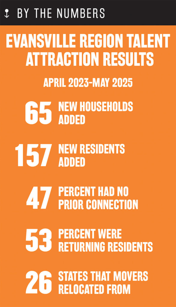 Abby Elpers, E-REP’s marketing director, says between the two programs, 40 new households (98 individuals) relocated to the area in 2024, and 15 of those had no prior connection to Evansville. Thirty-eight percent of the new households purchased homes locally. Relocated workers came from 15 different states and earn an average wage of $112,307.