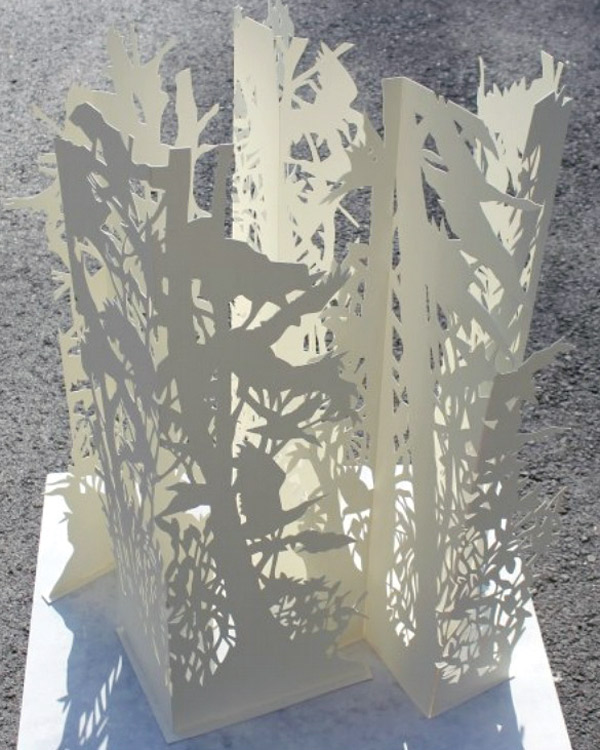The first work born from this reformation was a set of wood panels. She first took large pieces of wood and drew the destroyed trees on the 4-foot by 5-foot panels. Then she cut the trees away to symbolize they were now missing. She tries different ways to address the environmental crisis with her art, she says. Other commission works have centered around water, habitat, oxygen, climate change, and even the Gulf Oil Crisis.