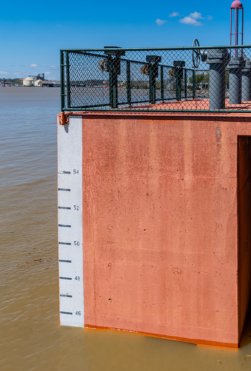 With all this river watching, astute observers may notice something else: a sudden drop in barge traffic. It’s not that the push boats can’t navigate these swollen waters — they can — but the flood levels lift barges too high to fit beneath the conveyors that load them. If they can’t load cargo, they can’t earn revenue, so many vessels simply wait it out until the waters recede.