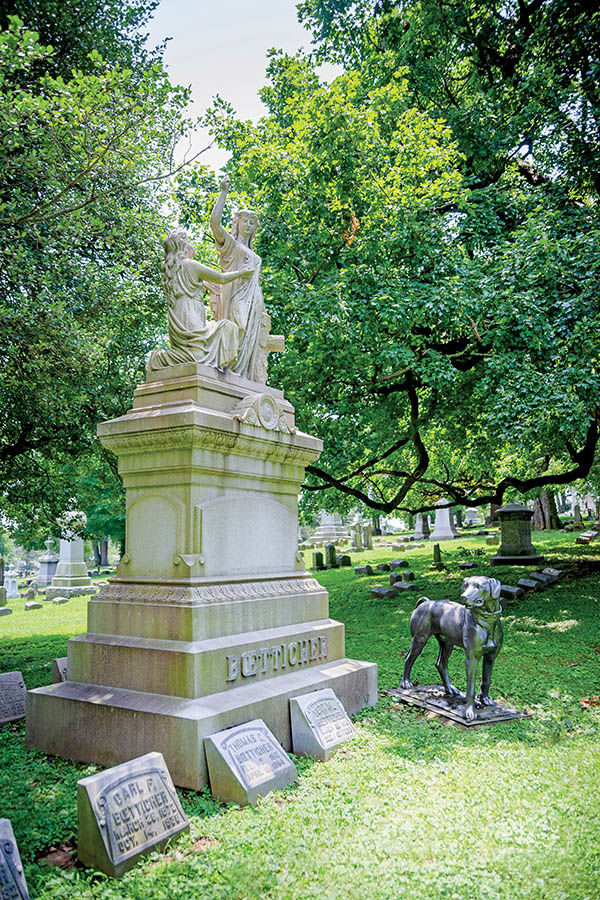 Among the winding pathways and picturesque trees of Oak Hill, in section 25 sits the family plot of the Boettichers. The resting place of 16 members, the interments are protected by a statue of a mastiff, placed there by family member Betty Boetticher.
