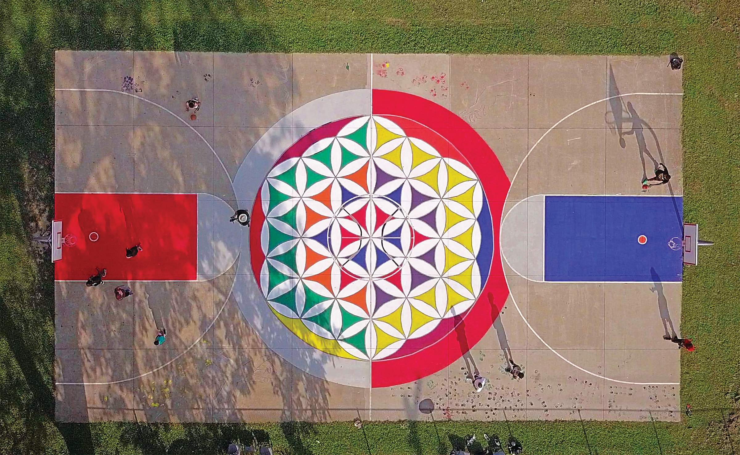Foot traffic on the Tepe Park basketball court along South Garvin Street bustles as neighborhood residents have all been drawn to the vibrant, full-court mural of the geometric symbol the Flower of Life. The Evansville natives behind the colorful painting — Corderro Stith, Merrick Korach, and Austin Maxheimer — say creating an enhanced community space was the goal all along.