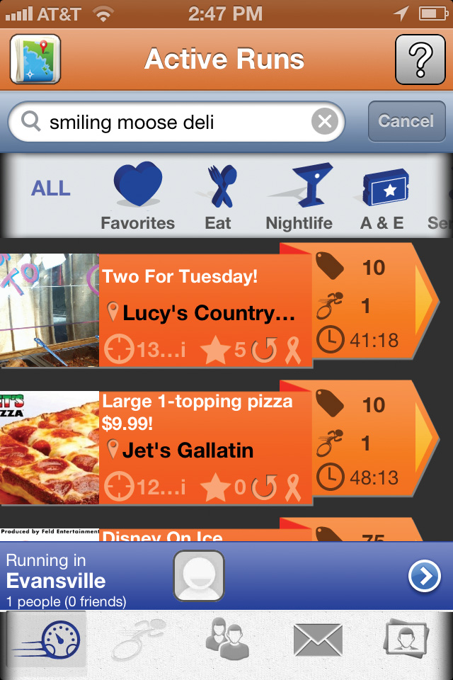 SPEADI first launched in Fenton, Mich., and later in Nashville, Tenn. “They need to be bigger cities with relevance,” Denison says. With a home currently in Evansville, she saw no better city to implement the app. The Smiling Moose Deli on Burkhardt Road hosted a SPEADI day on Aug. 25. “It got us a few more customers that day,” says Dave Deisher, owner of the deli. “SPEADI had cheap advertising, and I have high hopes for it.” Each business that signs up for SPEADI will have a QR code that allows “runners” (SPEADI users) to check in to receive the deal, and these runners can compete with each other to become city champions — or just smart, competitive consumers.
