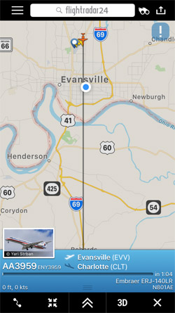 its flight path, and altitude, among other data. Sometimes the plane has taken off from EVV, like this flight (right) awaiting departure to Charlotte.