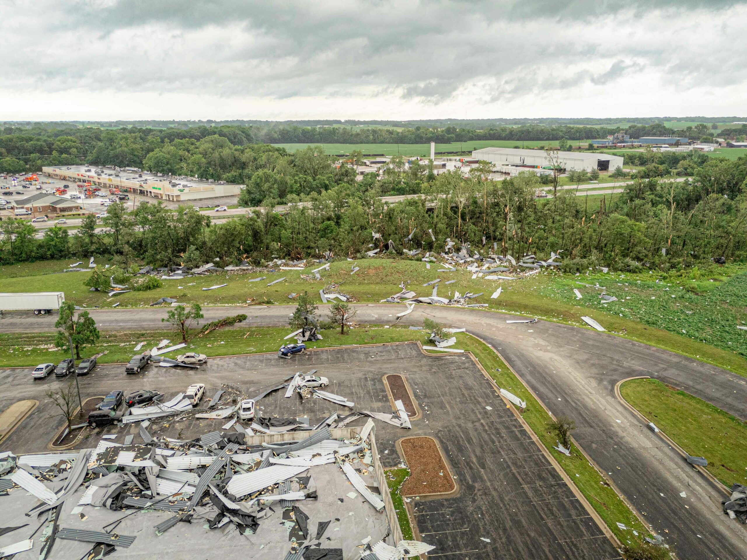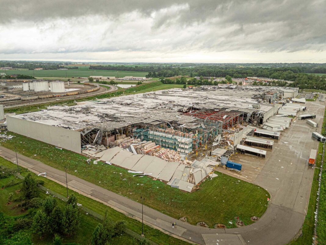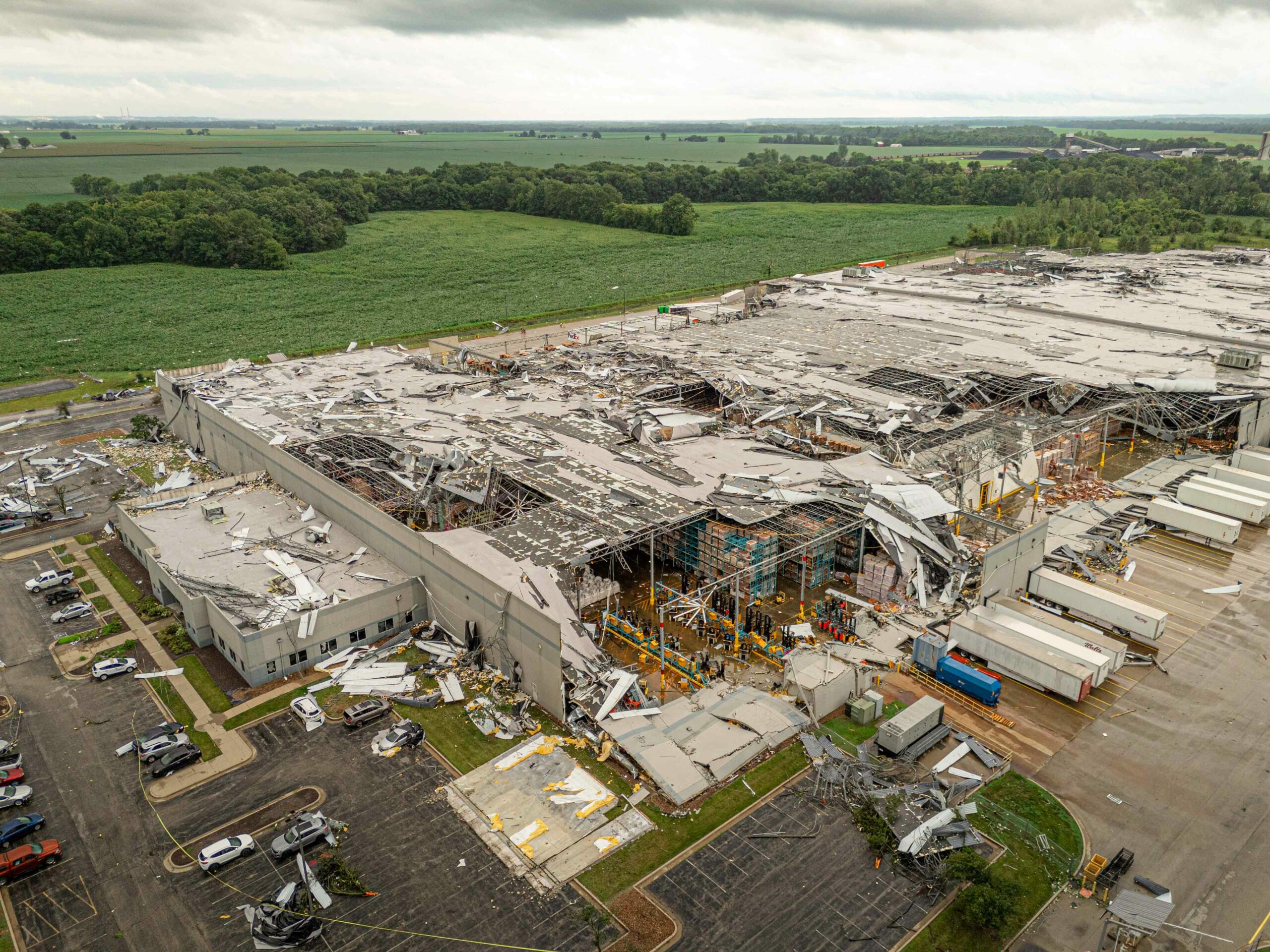 Before striking Kenco, the same EF-3 tornado caused tree debris and flattened crops near Port Road, just south of the factory. It continued north of Kenco, overturning semitrailers and train cars near Old Highway 62 and damaging roofs of homes and farm buildings along the way. The Zone by Maryscotts, a restaurant in Mount Vernon, cited damage  in its decision to close temporarily, writing on July 12 via Facebook that “the amount of product loss is overwhelming.”