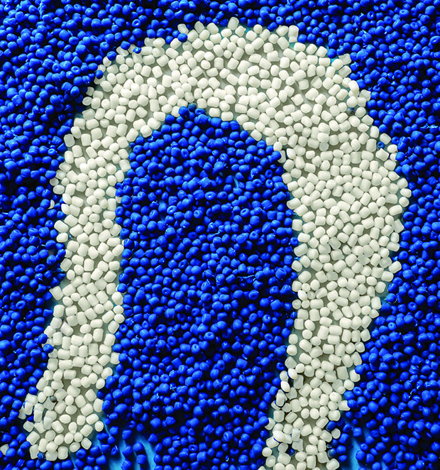 Eighty percent of the raw material used to make the pellets comes from recycled plastics. The rest is made through prime compounding, the process of incorporating additives and modifiers into polypropylene, which is melted together and cooled to produce the pellets.