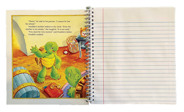 Hatchett adds a library card and cardholder with a custom Upcycled Doodles sticker on the inside cover of each book, which retains its original storybook pages. It takes Hatchett between 15 and 30 minutes to create each journal.