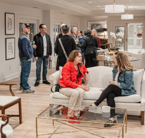 To refresh the look and feel of the 36-unit building’s entrance, a facelift of the lobby and community room was ordered last year. Under the guidance of resident and designer Tay Ruthenburg, owner of 70-year-old firm Evaline Karges Interiors, modern accents sit among English style furnishings. Large pendant lights suspend above mahogany armchairs flanking a camelback couch reupholstered in a geometric print. Monochromatic lamps and contemporary wall art play against an antique console table and Karges baker desk, both made of English pine. Muted greens and blues mix with brass accents and minimalist, glass-topped coffee and breakfast tables.