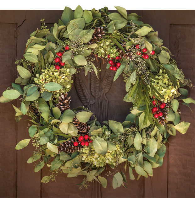 Today, evergreen is seen the most during the fall and winter months; however, wreaths can be made from a variety of dried flowers, leaves, and more. Mary Ellen Damm of Timberview Flower Farm recommends using dried seasonal flowers available to you — such as hydrangeas, cockscomb, and roses. This year, she says eucalyptus leaves, seen here along with red berries and pinecones, are gaining popularity.